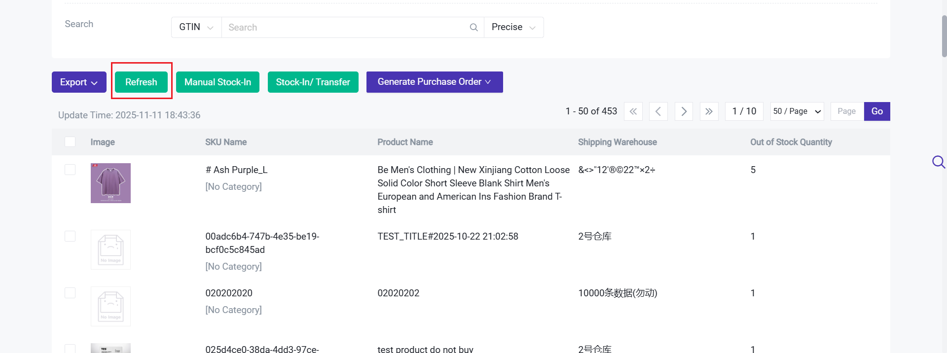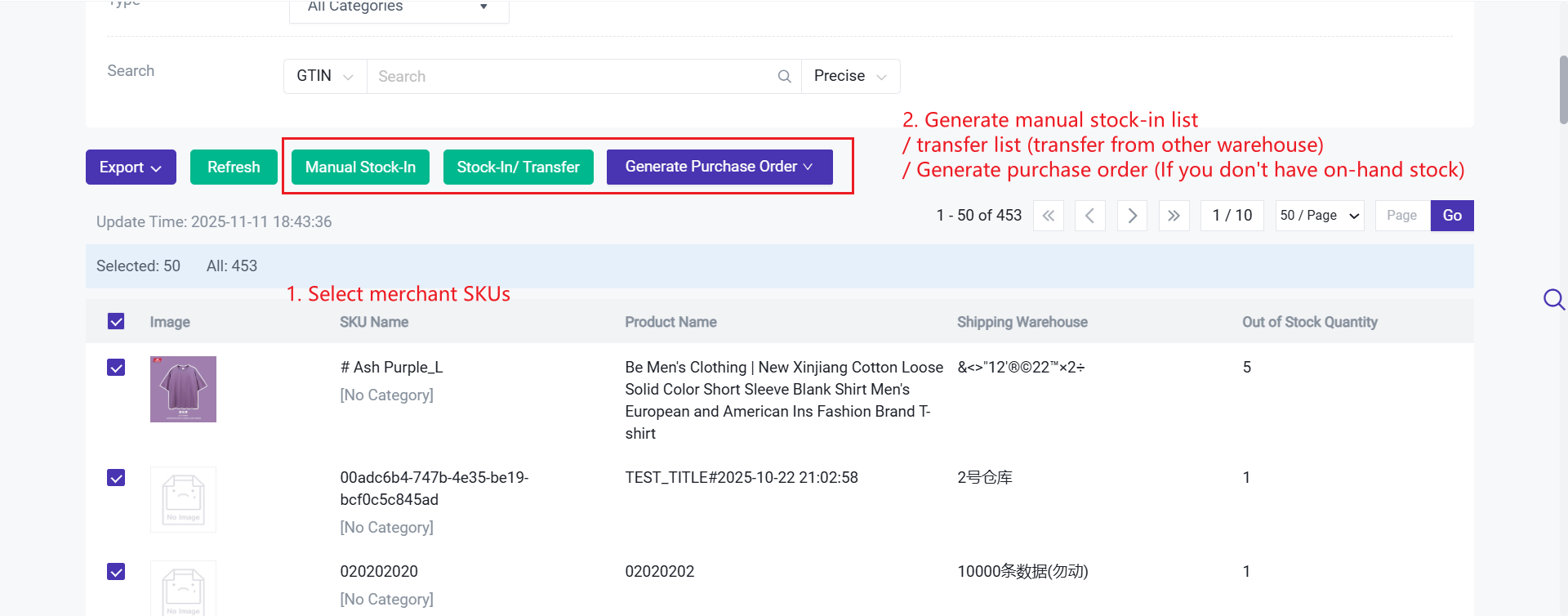 Step 3: For out-of-stock SKUs, you can generate a stock-in list or transfer list with one click, or create a purchase order to carry out subsequent restocking.