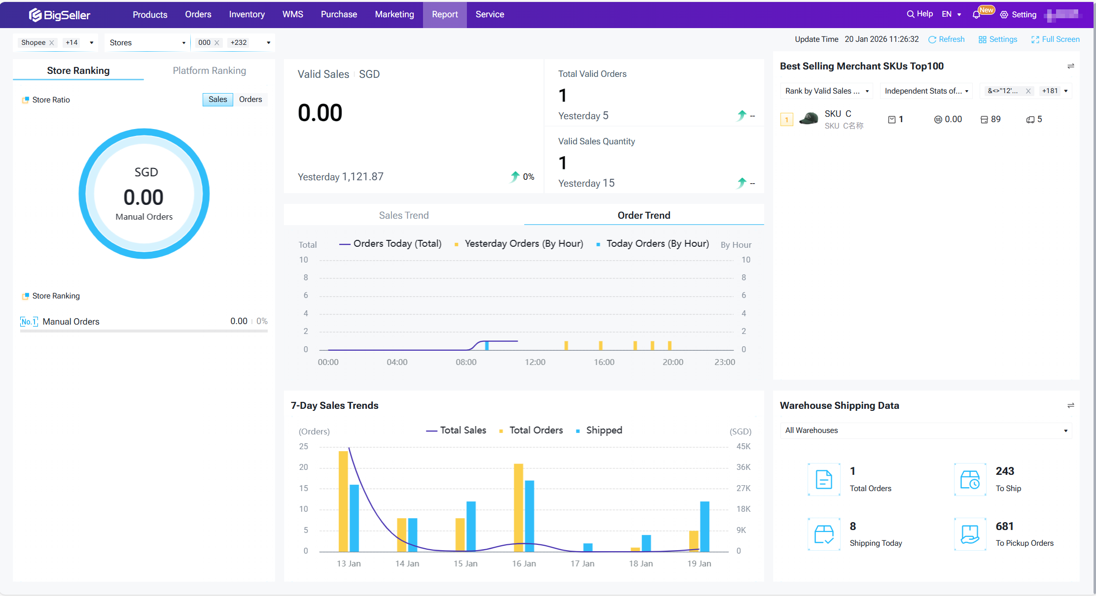 - Shipping Today: Only count the number of packages packed and shipped in BigSeller (Including the number of packages shipped from own warehouse and third-party warehouse shipments.