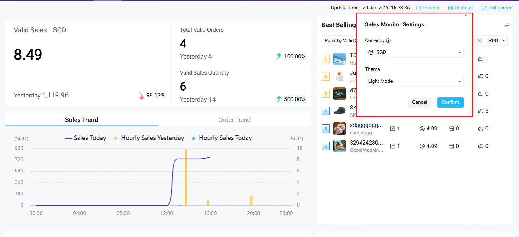 - Currency Setting: Click "Settings" to switch currency for sales data. If the selected currency differs from the sales market currency, the system will use the fixed exchange rate if set, or today's live rate if not.