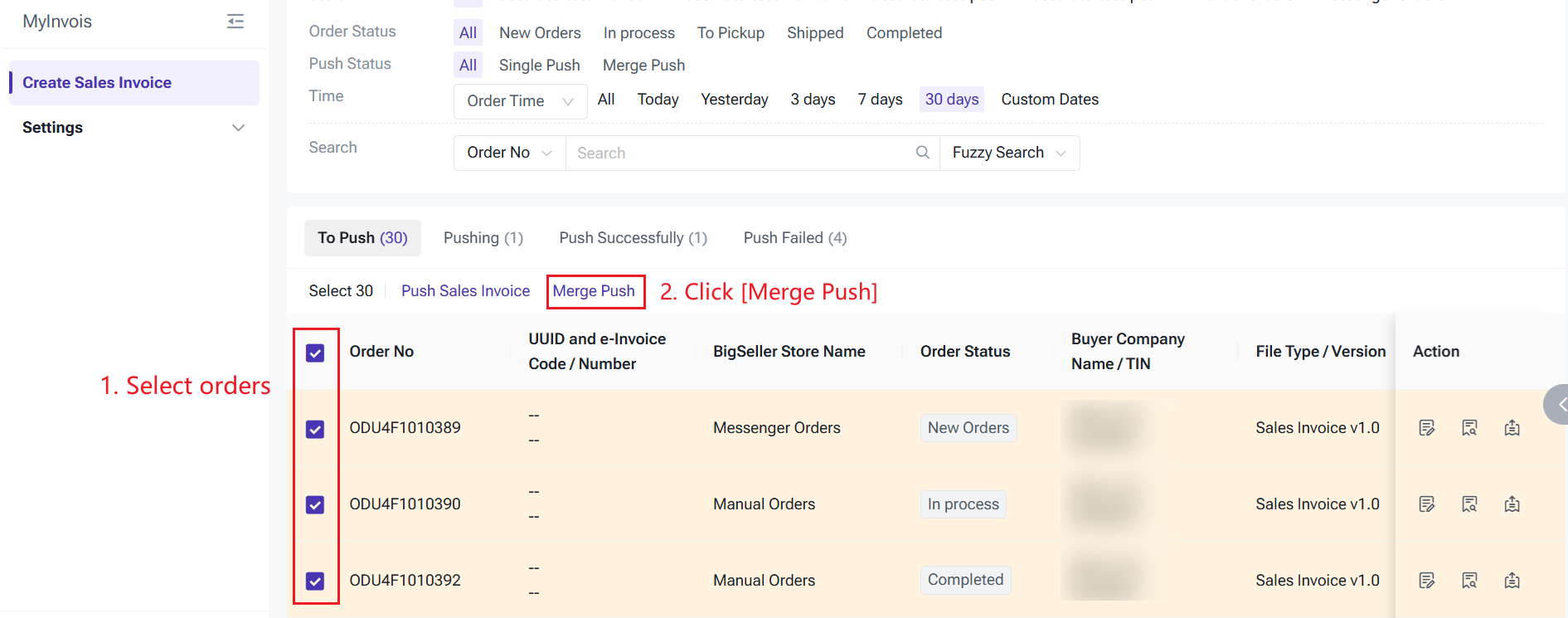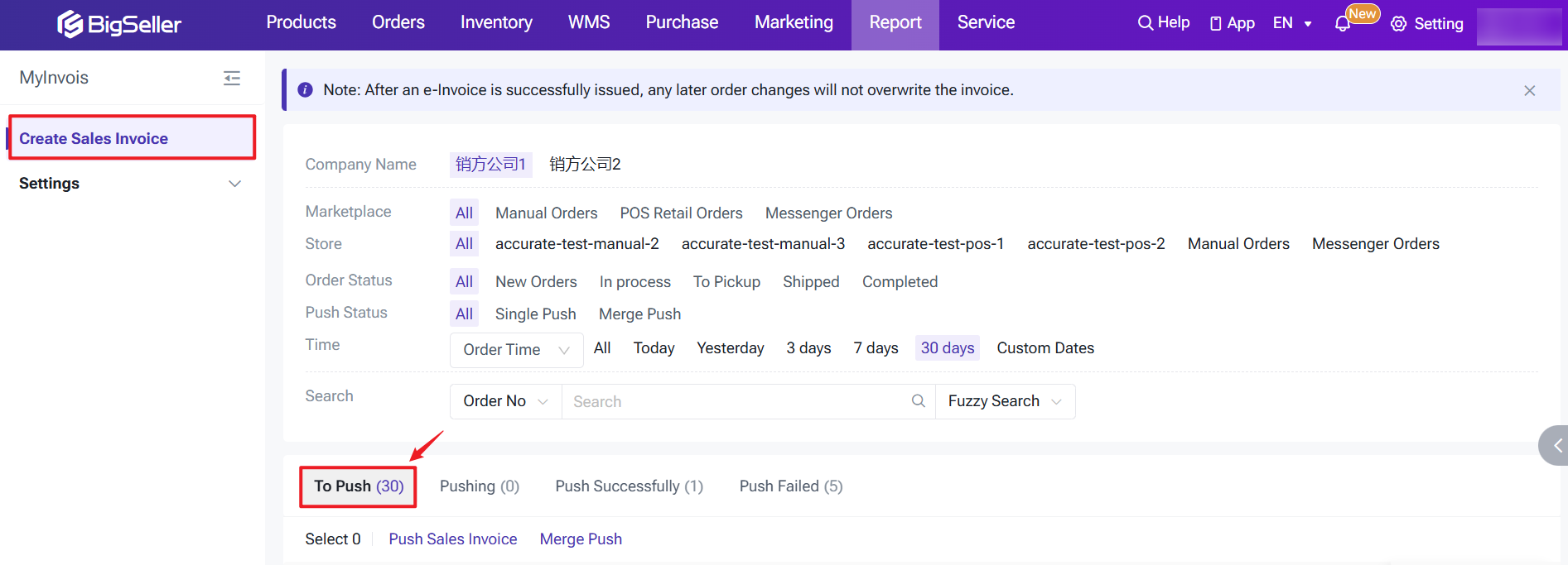 Once the invoicing information is set up, BigSeller will sync order data from the current and previous months, including manual orders, messenger orders, and POS retail orders that have been shipped or completed. These orders will automatically be added to the [To Push] list.