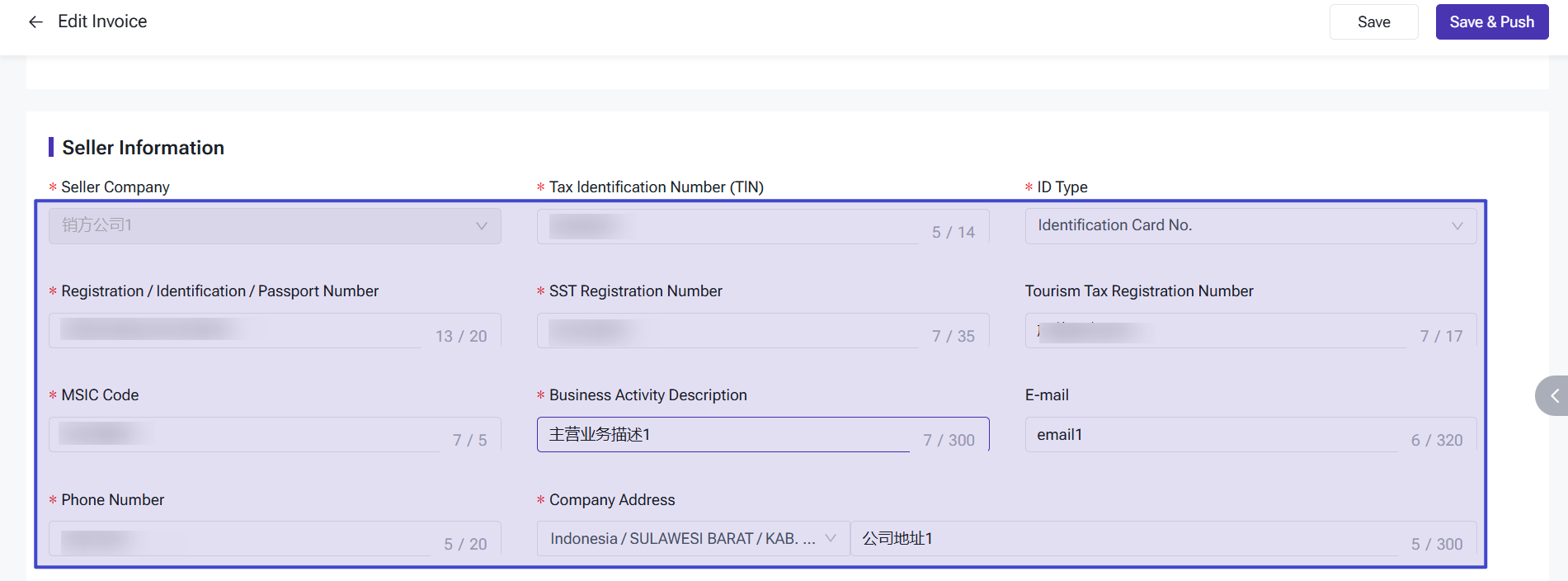 - Seller Information: Select the seller company, and the system will automatically populate the details from the invoicing page.
