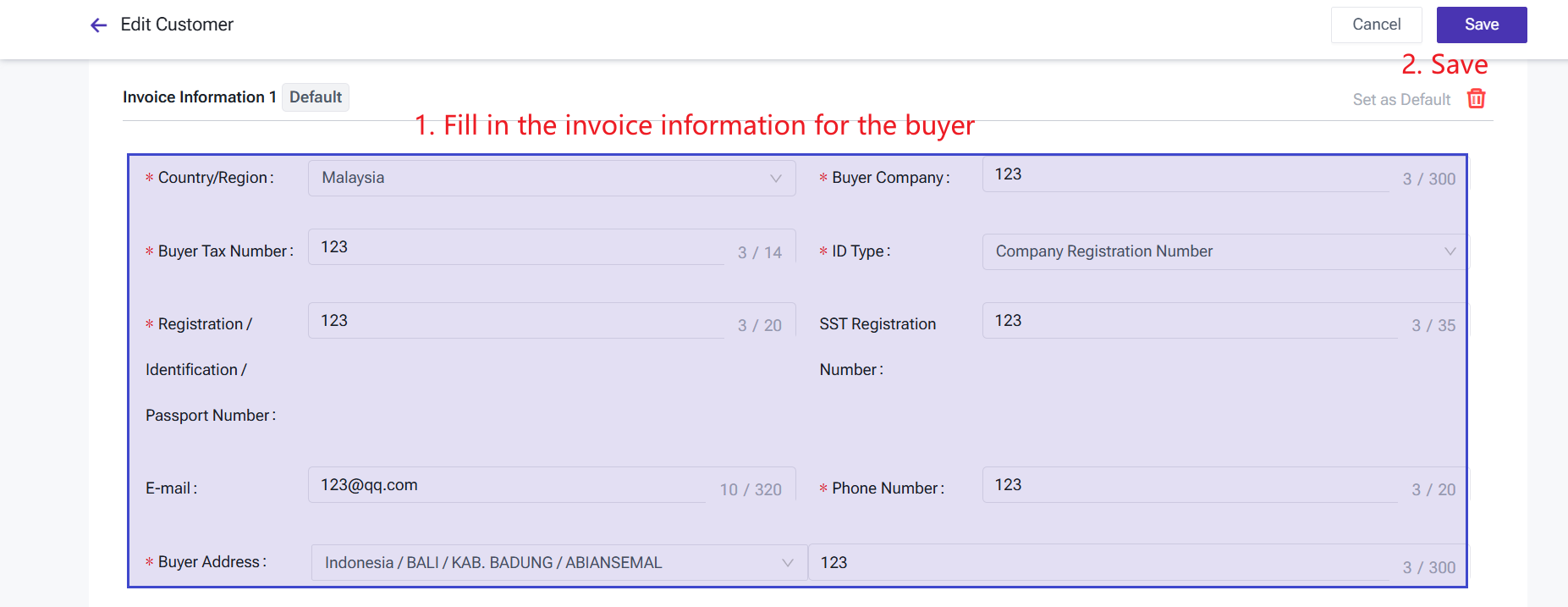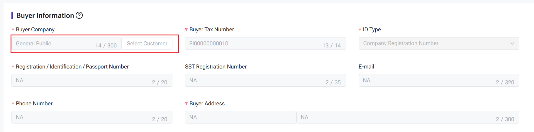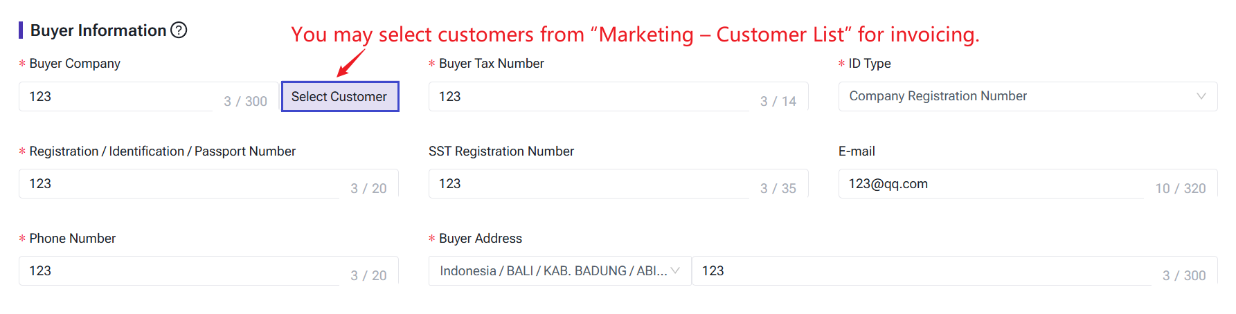 - Buyer Information: If the customer's Malaysian invoicing details are available in BigSeller's Marketing > Customer Manage > Customer List module, they will be auto-filled. Otherwise, you'll need to enter them manually.