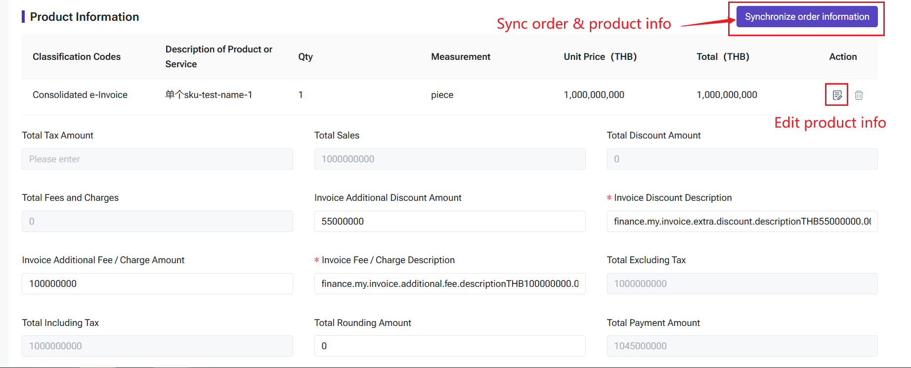 - Product Information: Click Sync Product Info to retrieve the product details from the order. You can edit or remove products as needed.