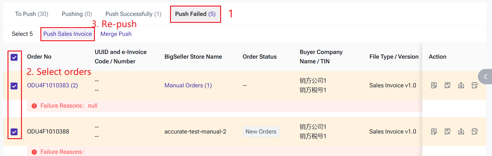 3. If the push fails, the status will be updated to Push Failed, and you can retry pushing the invoice.