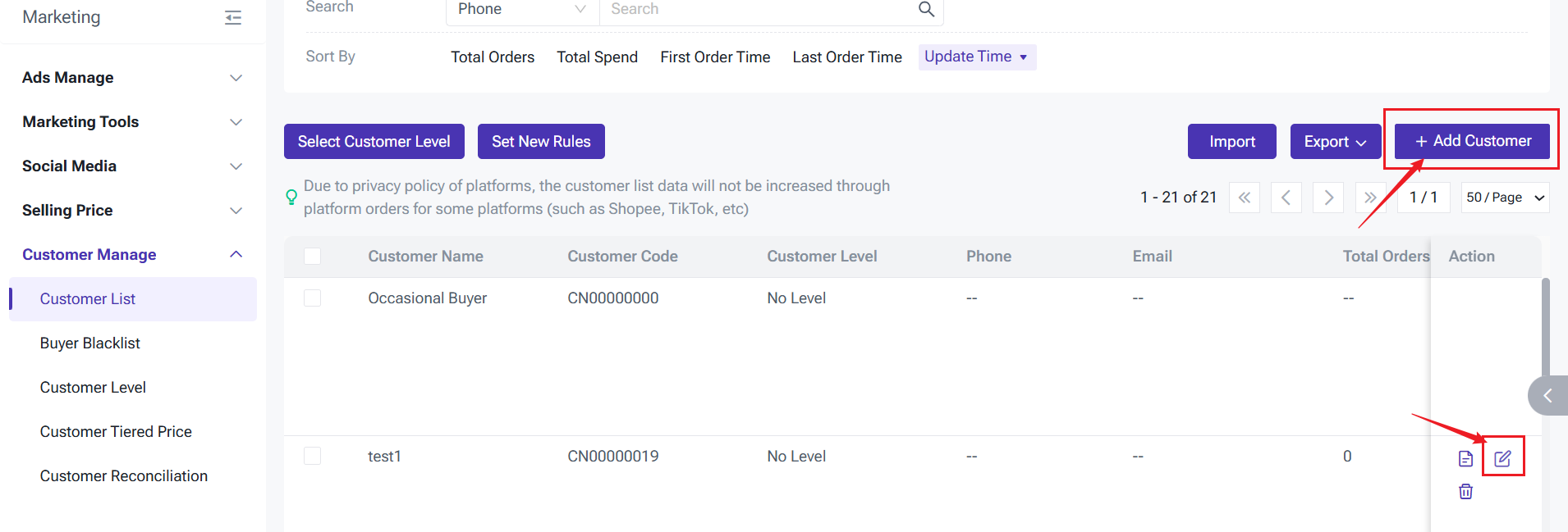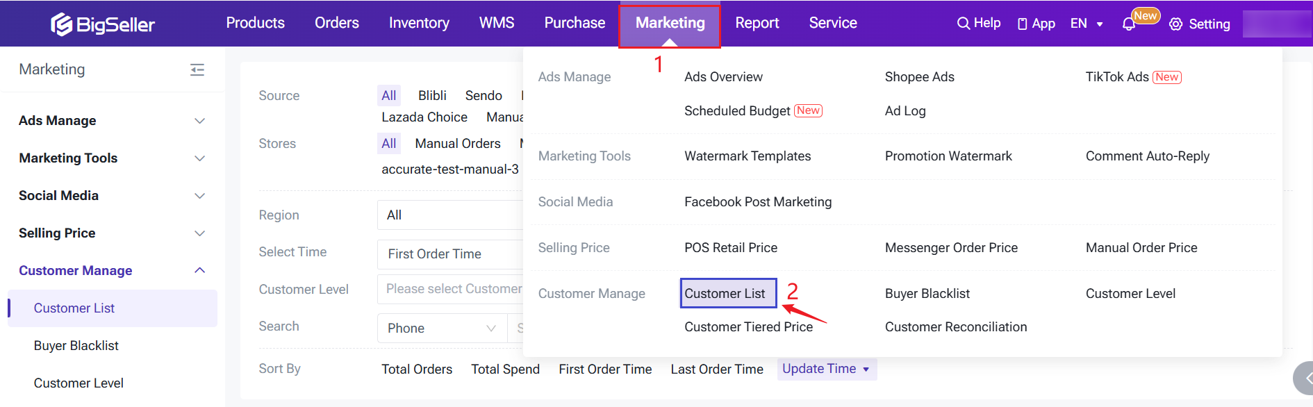 Step 1: Go to Marketing Module > Customer Manage > Customer List