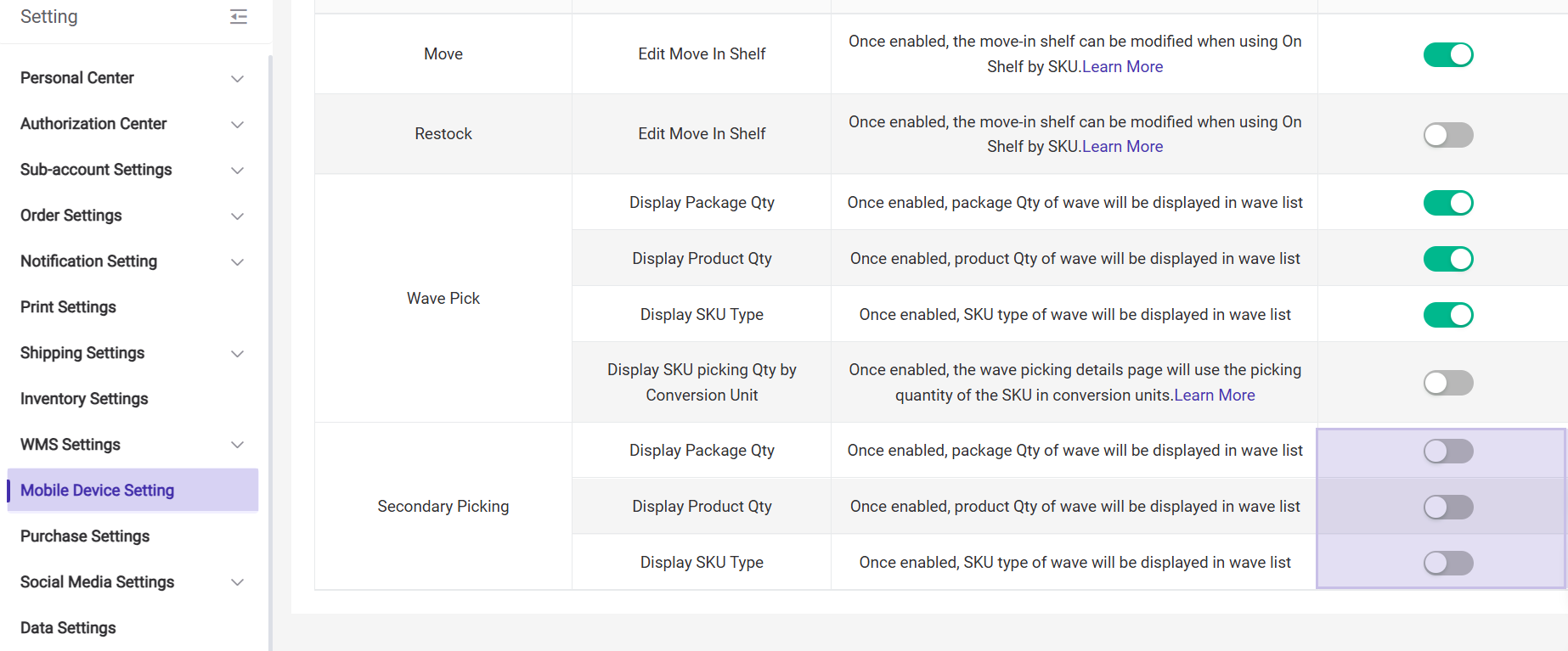 2. Mobile Device Settings: In the APP Secondary Picking list, the display of package count / item count / SKU types within a wave is turned off by default. When enabled, the corresponding fields will be shown.