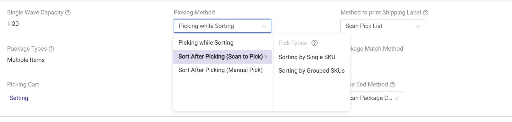 3. Picking Method Settings: Must be set to 'Sort After Picking - Scan to Pick'