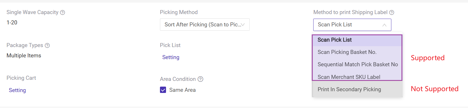 4. Methods to Print Shipping Label: Currently, it is not possible to print shipping labels through the app's Secondary Picking function. Please choose a method other than [Print in Secondary Picking] to print the shipping label, or manually print the shipping label from the wave list before picking.