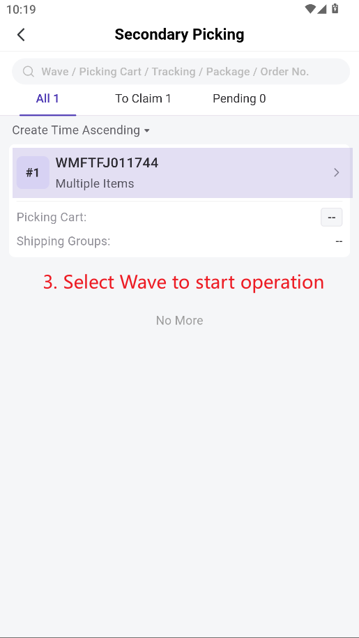 Step 3: Find the wave you’re about to pick (scan the wave number / tracking number / order number / package number), enter the Picking Cart No., and start the picking operation.
