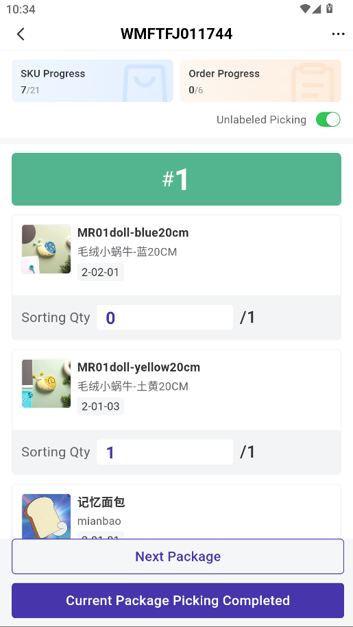 In secondary picking, once the labelled items have been scanned, you can turn on the unlabelled picking mode. In this mode, you can manually sort the unlabelled SKUs without the need for scanning.