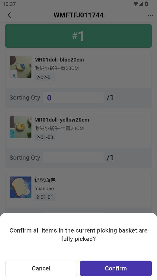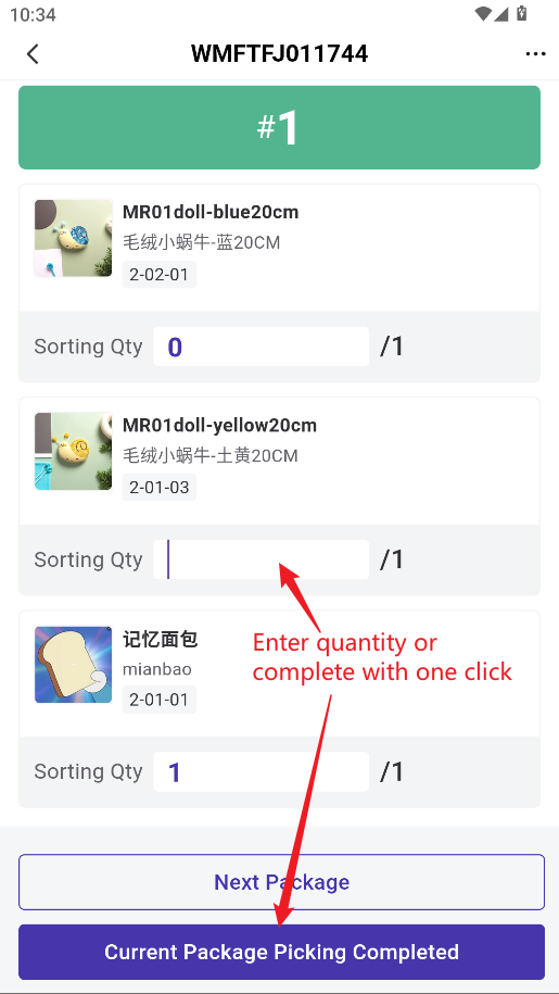 4) Manually enter the quantity of SKUs that have been sorted, or click [Current Basket Picking Completed].