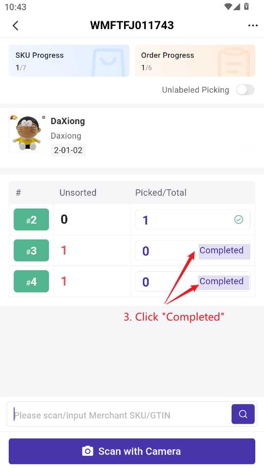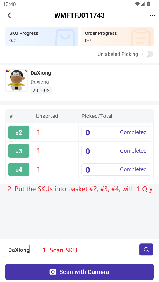 5) You can check which baskets the current SKU needs to be placed into. Once done, tap Picking Completed to quickly finish picking for that basket with one click.