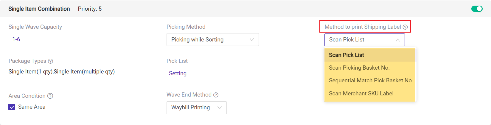 Print in Secondary Picking: Only applicable for the "Sort after Picking - Scan to Pick" wave type. Print the shipping label after completing sorting in the Secondary Picking page.