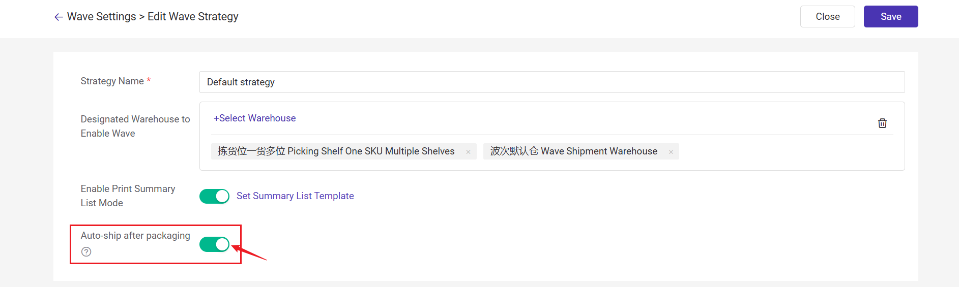 To enable: Go to Wave Setting > turn on Auto Ship After Packaging Completed.