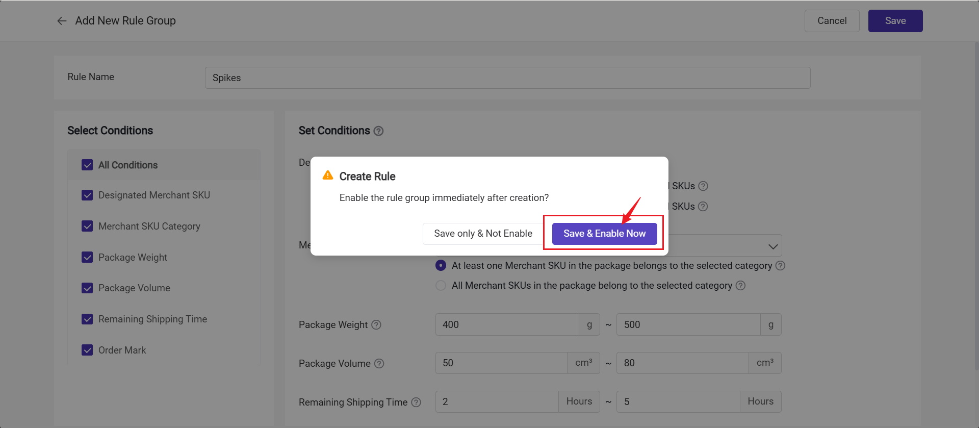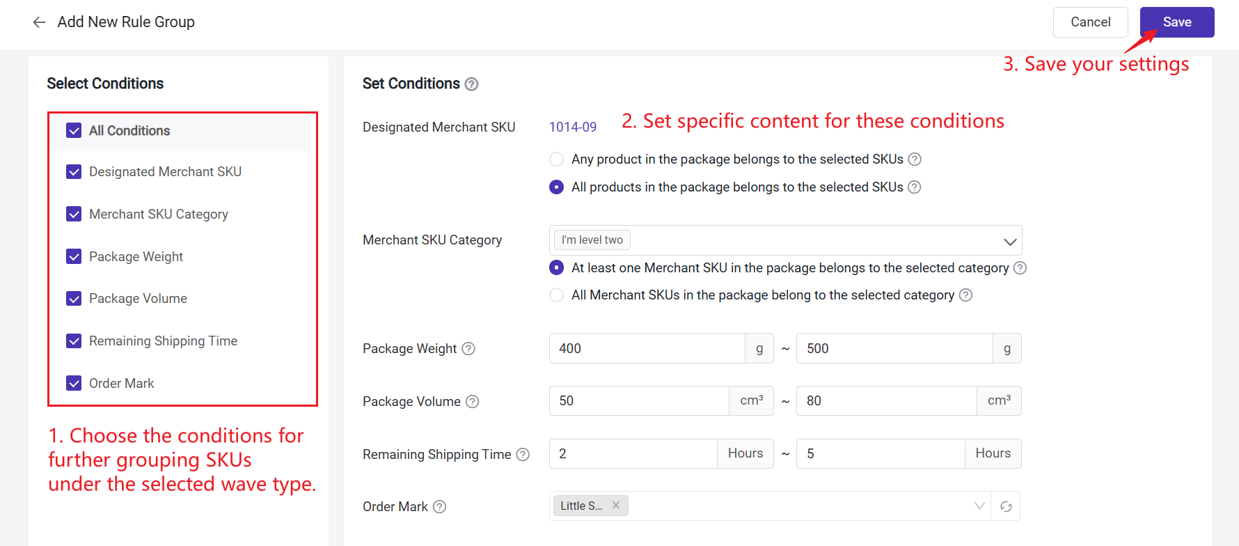 With rule grouping, sellers can automatically assign orders meeting specific conditions (e.g. designated SKU, weight, category, etc.) into the same wave. This helps simplify picking and packing processes, greatly improving warehouse efficiency.