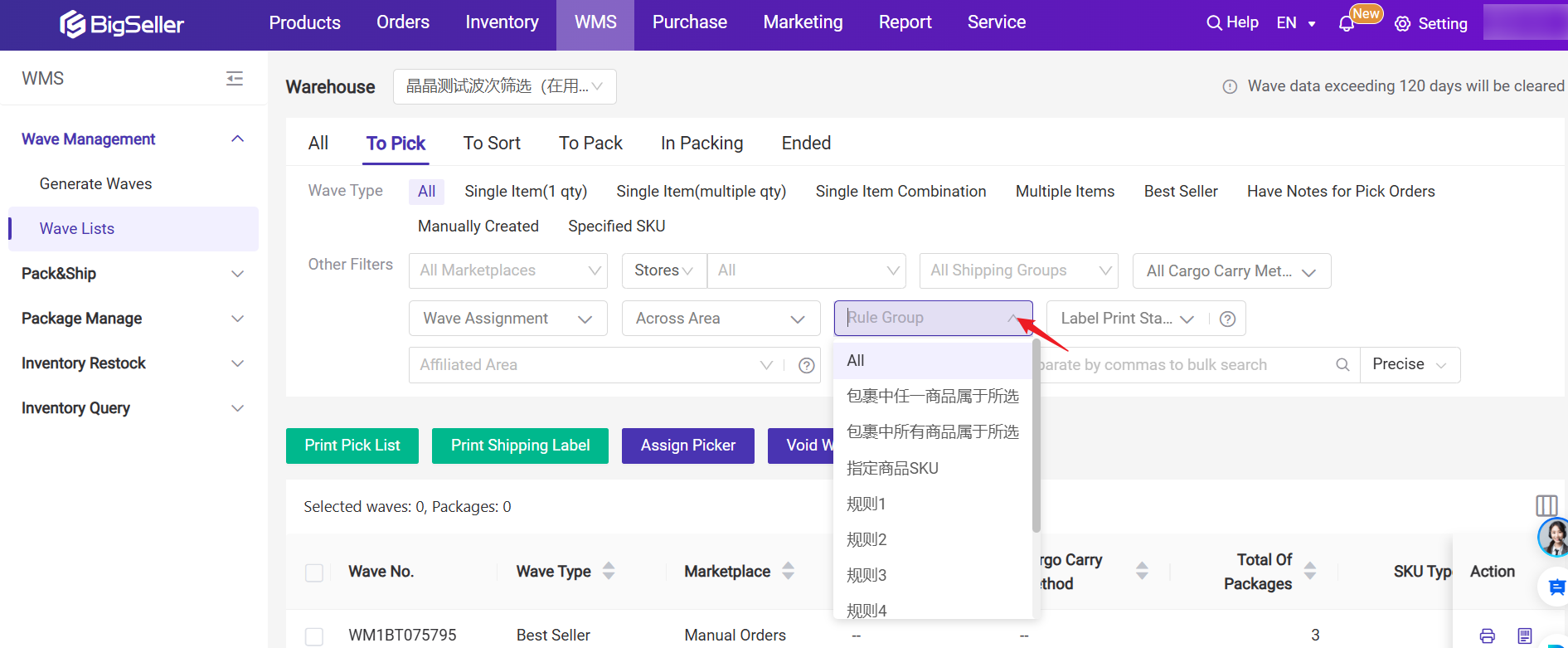 BigSeller has introduced a new Rule Group feature based on the existing wave generation logic. When generating waves, the system will first determine the wave type of the orders, then check if they meet any configured rule group conditions.