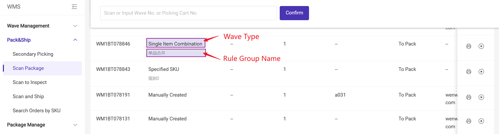 • The rule name will be isplayed on: To Generate Wave, Wave List, Secondary Picking, and Scan Package pages.