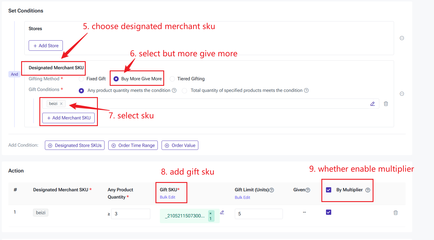 Step 2: Select Designated Merchant SKU > select Buy More Give More > set merchant SKU(s)
