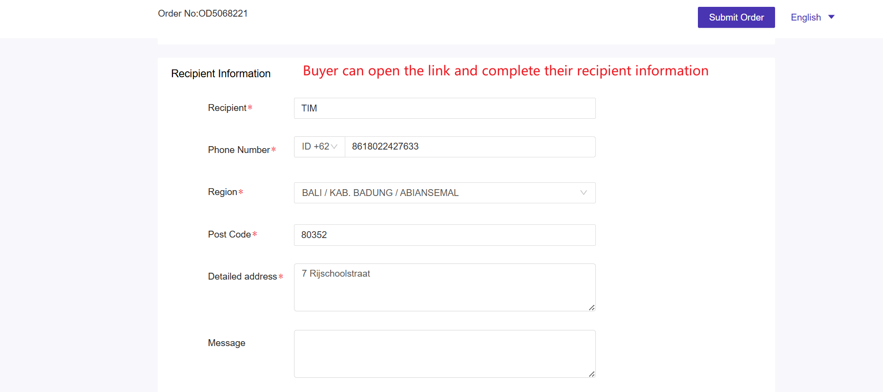 You can copy and send the link to the buyer, then the buyer can directly open the link, fill in their information, and complete the order.