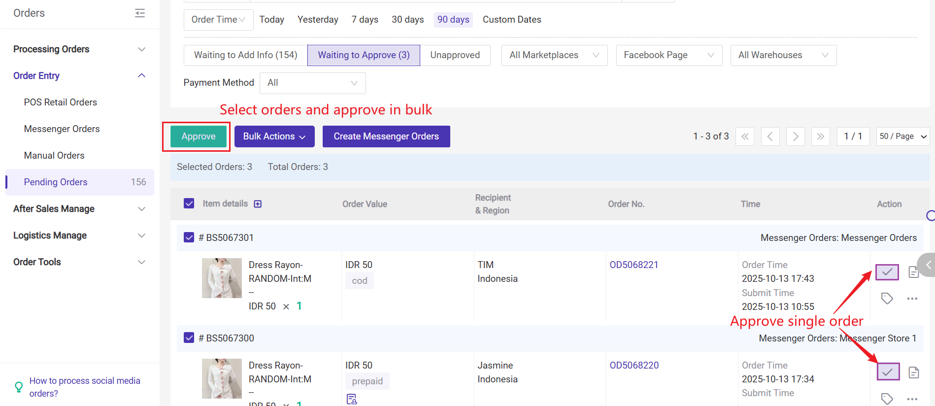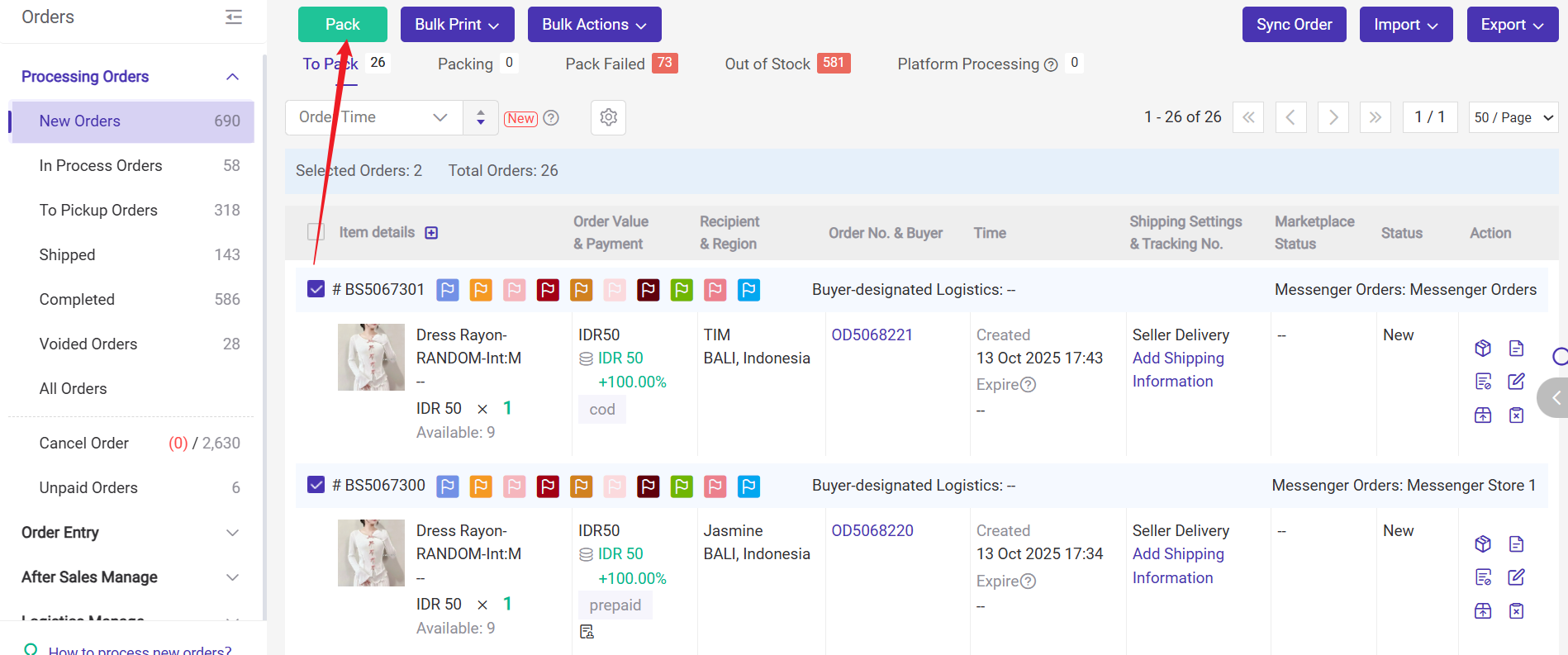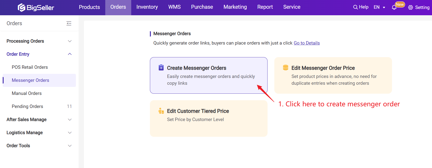 Once messenger orders are approved, the orders will move to [New Orders] list, and you can pack messenger orders and continue the order processing flow in BigSeller.