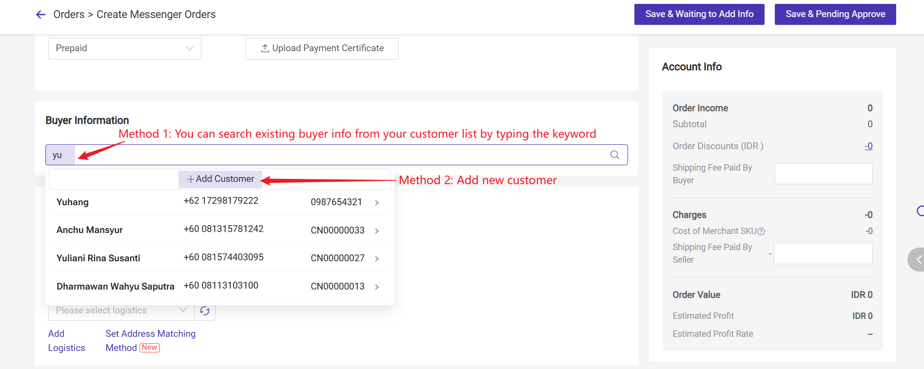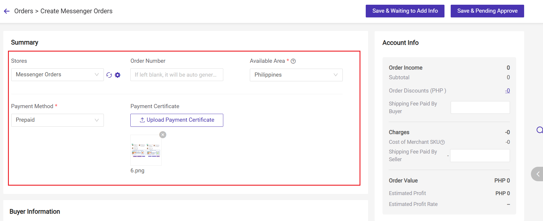 - Save & Waiting to Add Info: The buyer info and seller info can be empty.