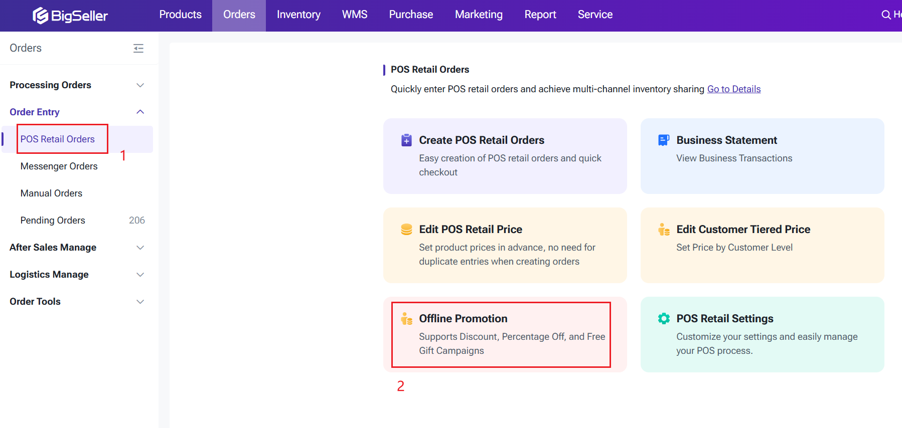 Marketing Tool Entry in POS Retail Orders: A new entry for the marketing tool is added to POS Retail Orders. Clicking it will redirect to the Marketing > Offline Promotion > Promotions page.