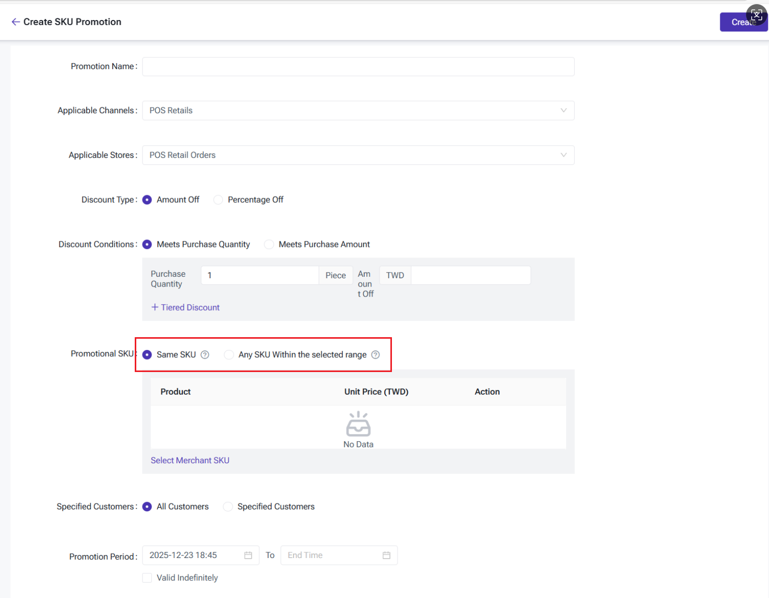 c. Promotional SKU: Allows selection of Merchant SKUs from linked warehouses within the store.