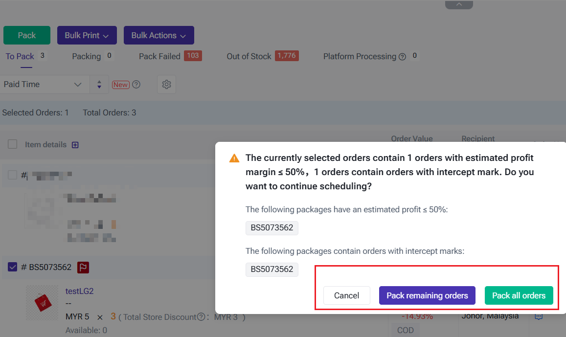 To prevent accidentally packing orders with low profits, flagged buyers, or blacklisted buyers in bulk, users can configure interception rules. The system will display a pop-up when the estimated profit margin of an order is ≤ X%. The following options will then show up: