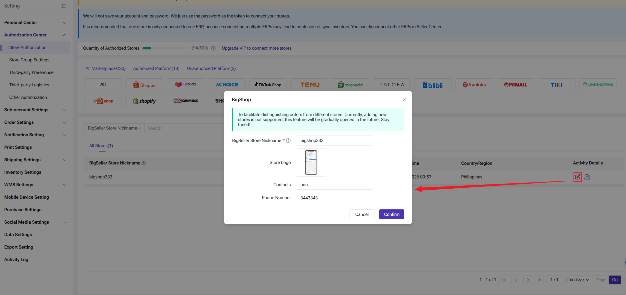 After successfully enabling the Distribution feature and finish supplier onboarding, the system will automatically create a BigShop store. Path: Settings > Authorization > Store Authorization > Select BigShop Platform