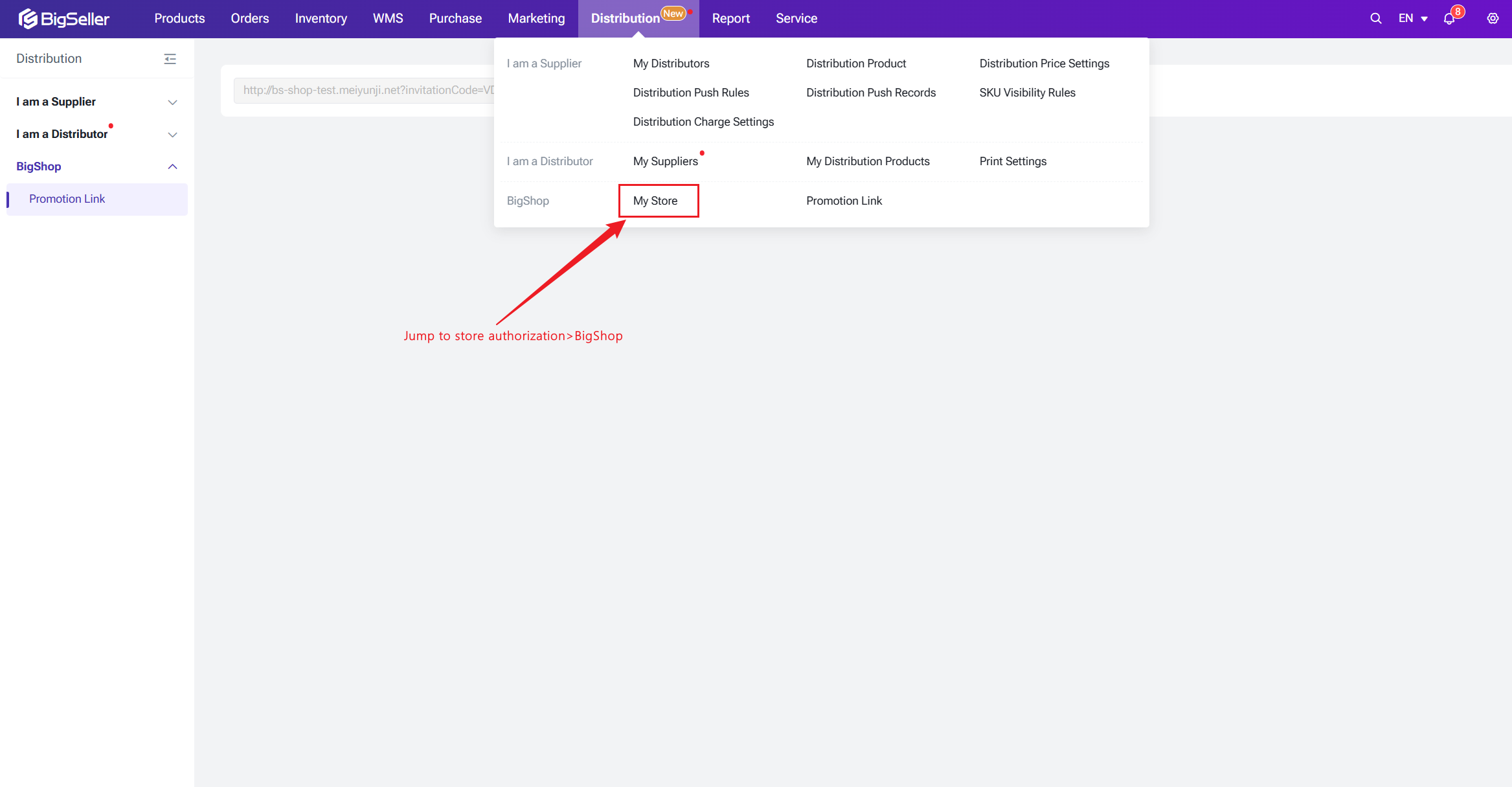After BigShop is created, a new “BigShop” section will appear under the Distribution module, featuring two key functions: