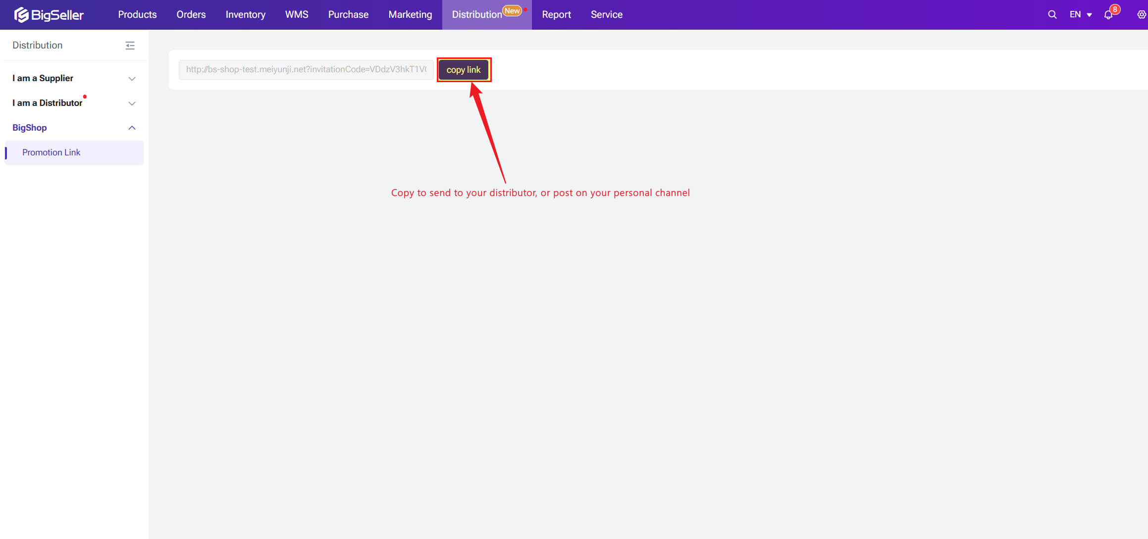 - Promotion Link: Copy your invitation link here to send to distributors. Partners can use this link to access your BigShop website directly.