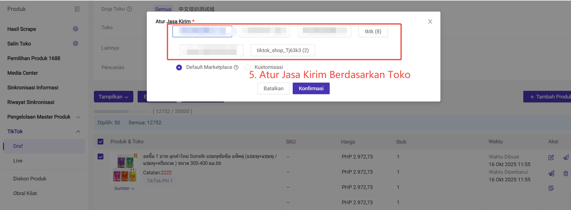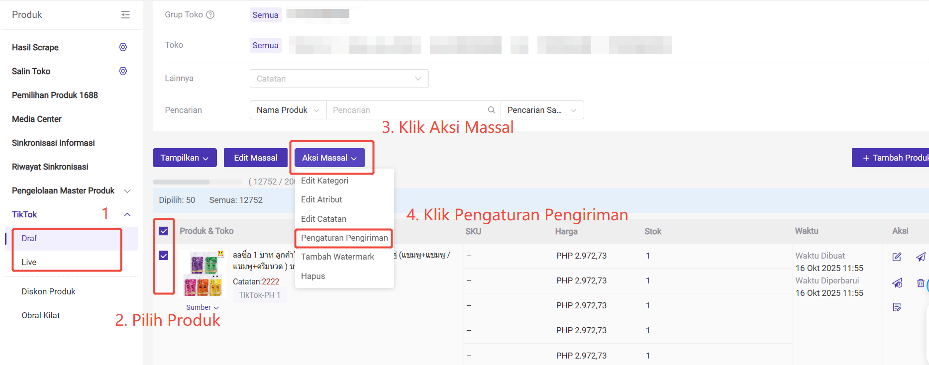 Sekarang hanya mendukung untuk atur pengiriman secara massal berdasarkan toko di halaman daftar draf & live produk Shopee dan TikTok.