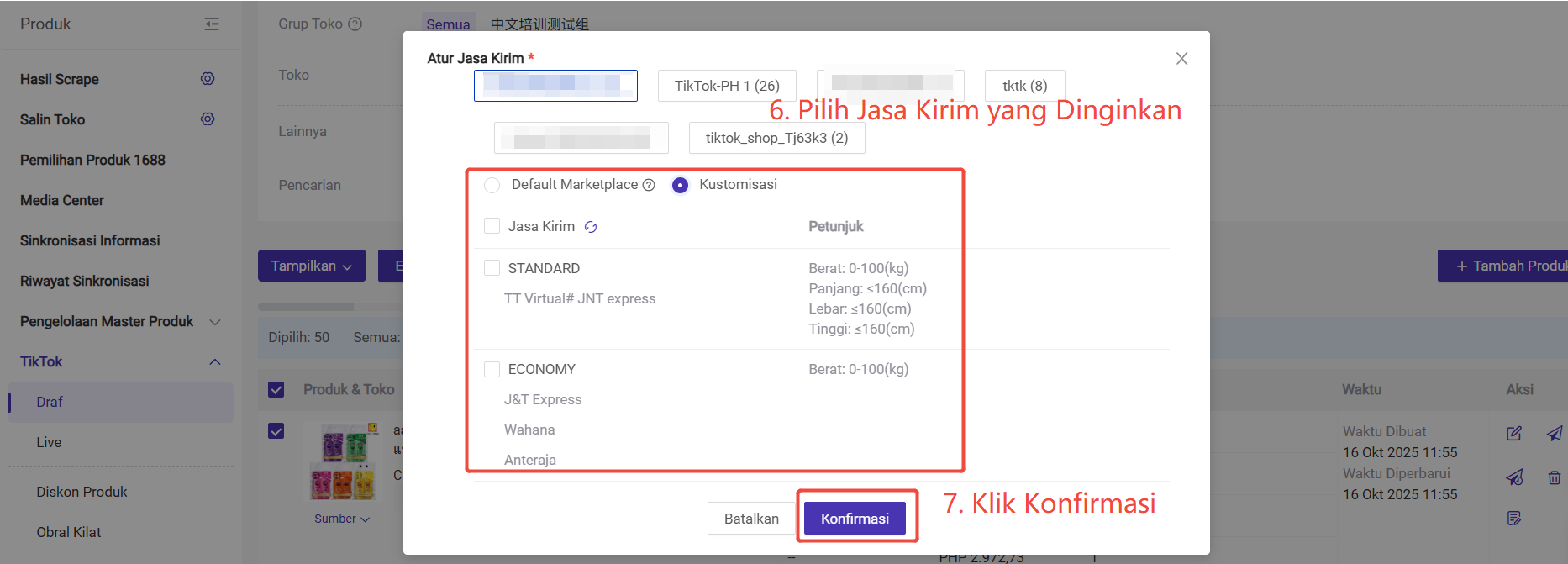 Masuk ke Halaman Daftar Draf & Live Produk Shopee/TikTok > Pilih Produk > Klik Aksi Massal > Klik PengaturanPengiriman > Atur Jasa Kirim Berdasarkan Toko