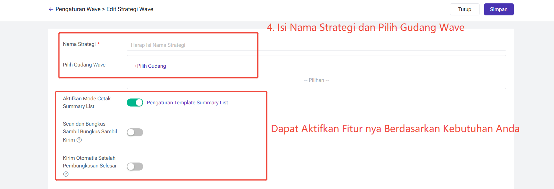 Kirim Otomatis Setelah Pembungkusan Selesai: Dalam Mode Pembungkusan Berdasarkan Wave, Jika Fitur Scan dan Bungkus - Sambil Bungkus Sambil Kirim Belum Diaktifkan, Maka Akan Kirim Otomatis Setelah Aksi Selesai, Jika Fitur Scan dan Bungkus - Sambil Bungkus Sambil Kirim Diaktifkan, Maka Setelah Selesai Cetak Label Pengiriman Akan Otomatis Dikirim. Dalam Mode Pembungkusan Berdasarkan Paket, Setelah Selesai Cetak Label Pengiriman Akan Otomatis Dikirim.
