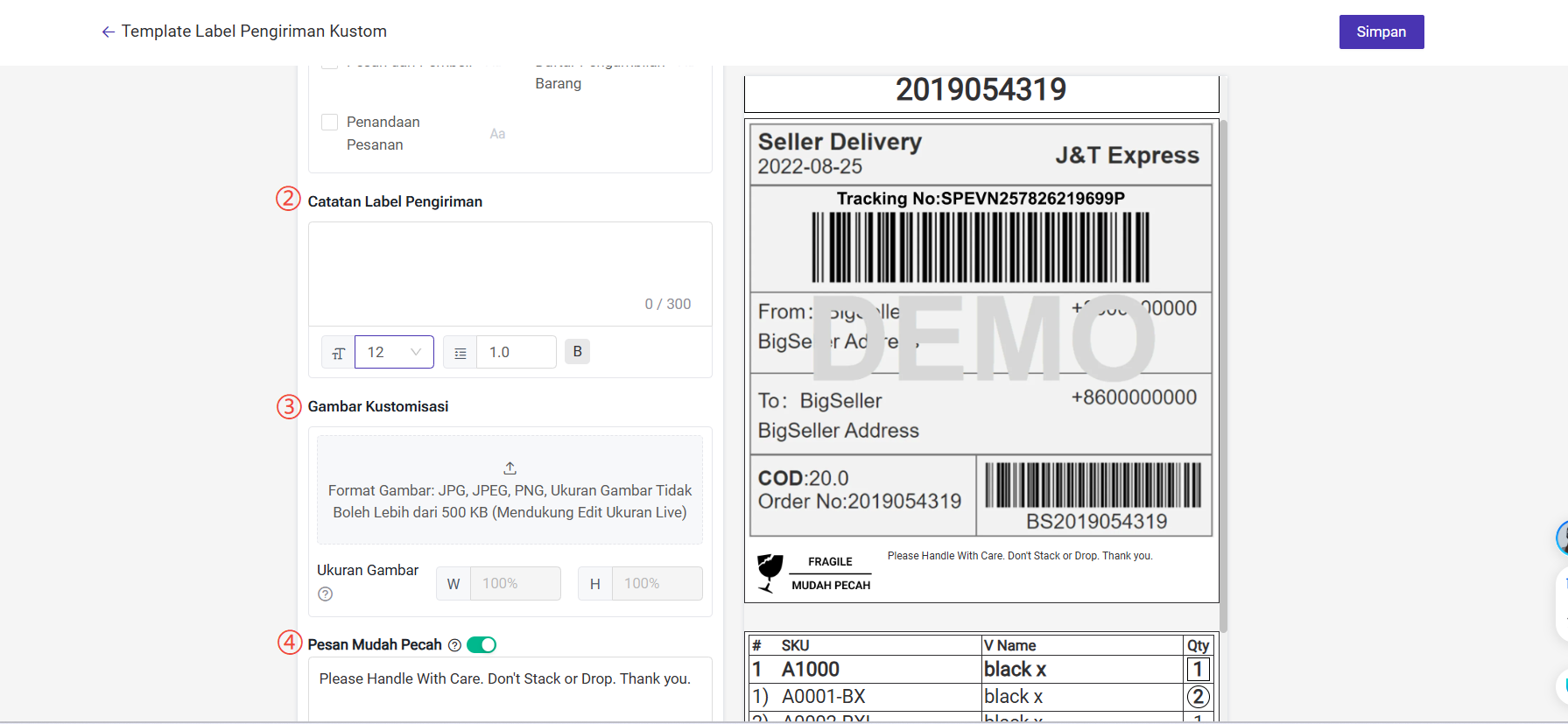 Selain itu, Andat dapat mengatur informasi yang ditampilkan pada Label Pengiriman sesuai dengan kebutuhan pribadi Anda, seperti tambahan peringatan pembukaan paket, peringatan barang mudah pecah, informasi barang, dan sebagainya.
