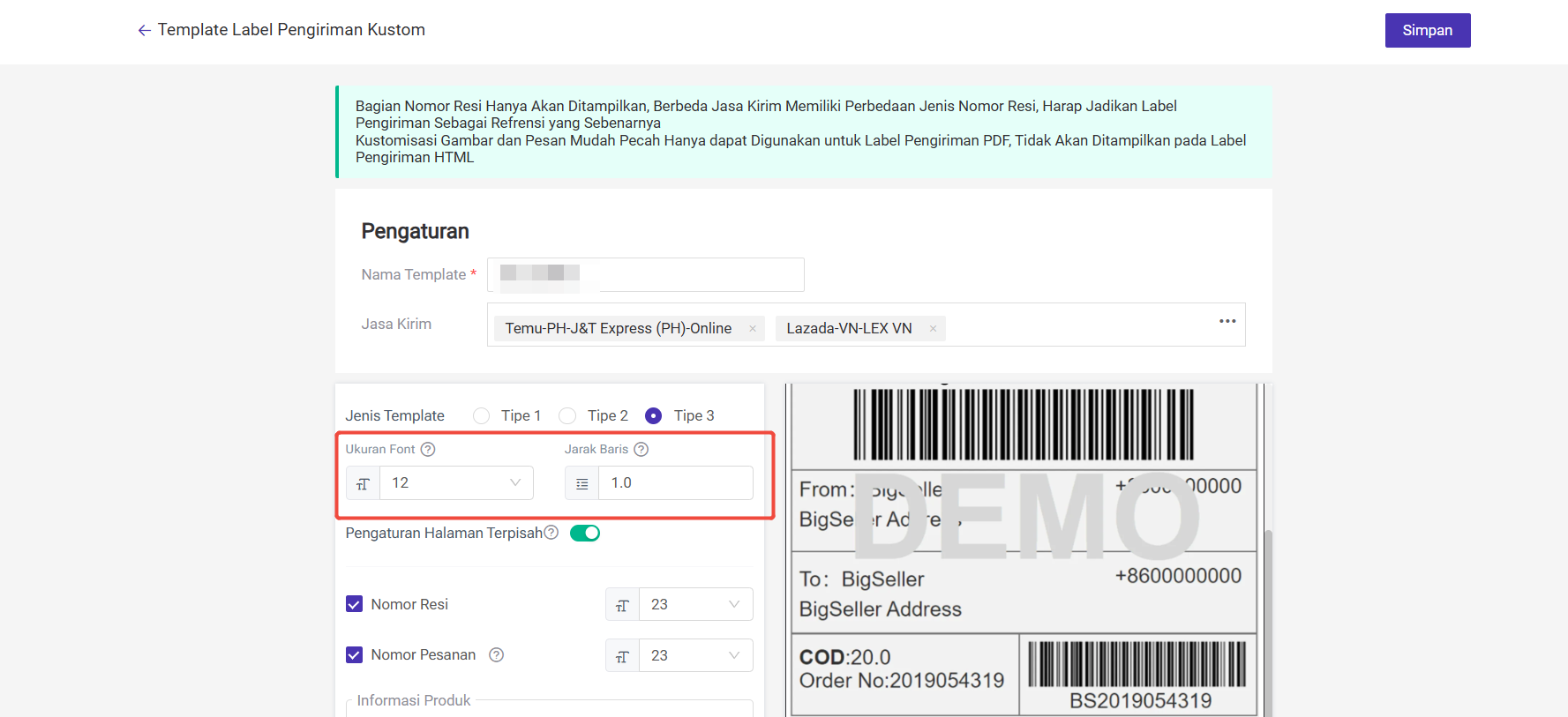 Jika ingin mengatur infromasi ukuran font dan jarak baris untuk template label pengiriman kustom saat ini, Anda dapat mengikuti langkah -langkah di bawah: