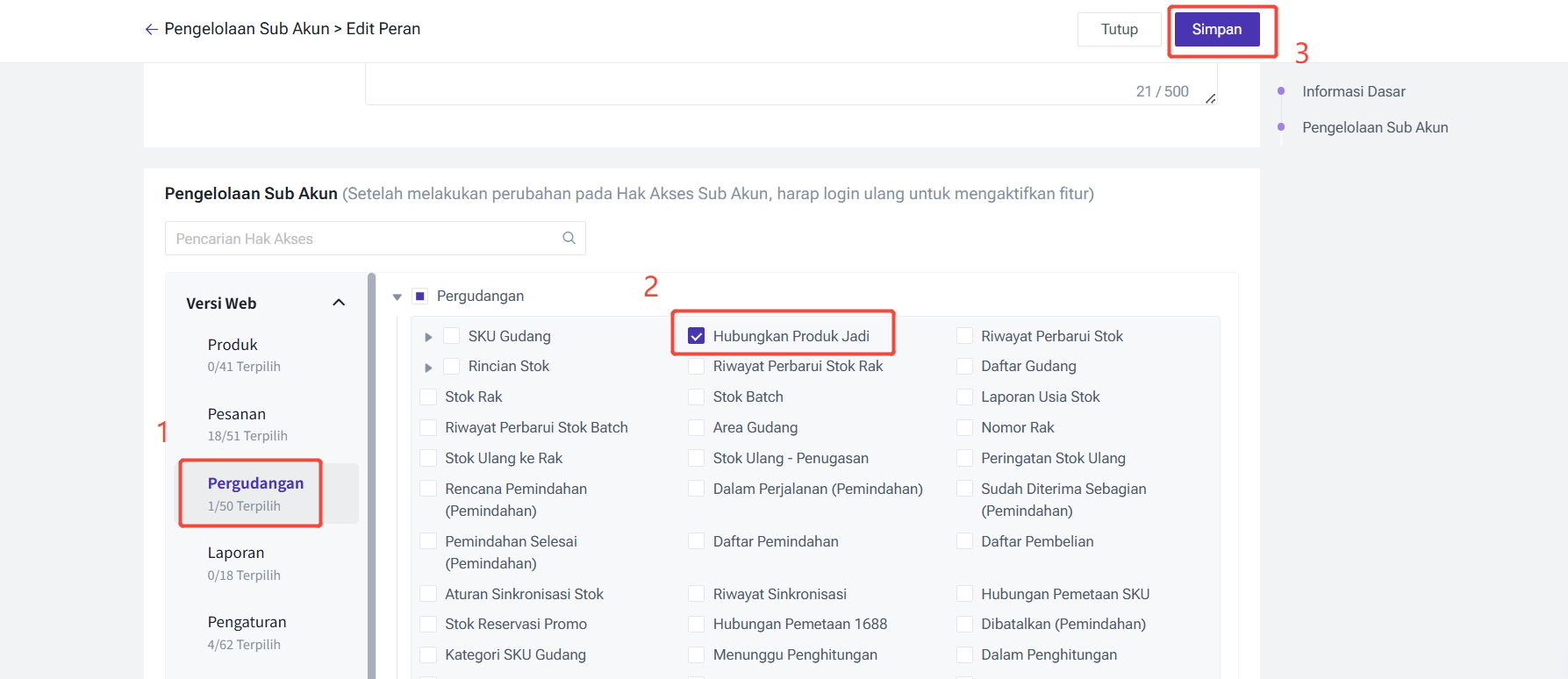 Langkah 2: Cari Pengaturan Hak Akses > Pilih Pergudangan > Pilih Hubungkan Produk Jadi > Klik Simpan