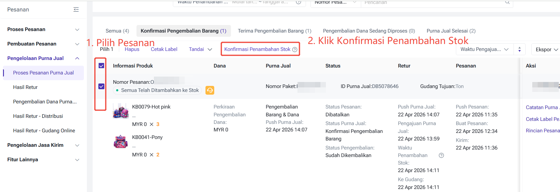 Kembalikan: Setelah melakukan aksi ini, pesanan akan dimasukkan ke tab 【Sudah Dikembalikan】. Di tab 【Sudah Dikembalikan】, juga dapat mendukung aksi push pesanan pengembalian, hapus pesanan pengembalian, menambahkan catatan untuk penambahan stok, cetak label pengiriman dan melihat rincian pesanan.