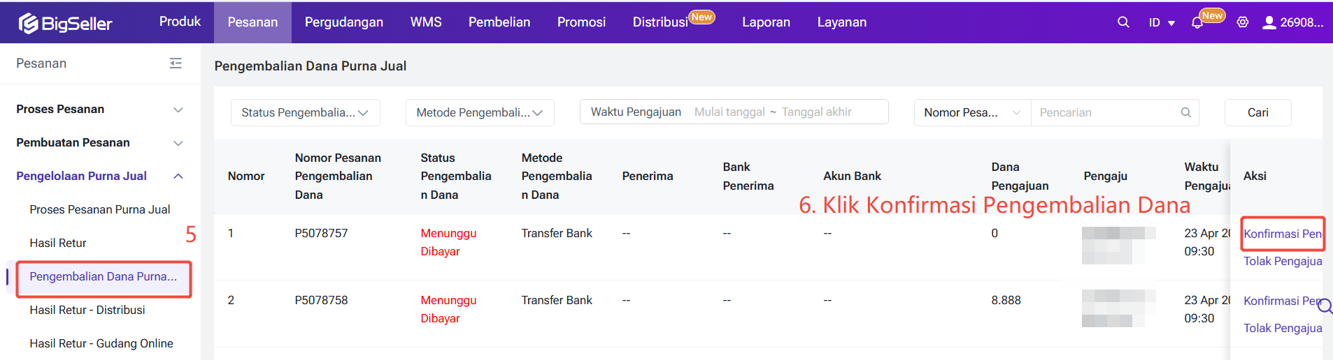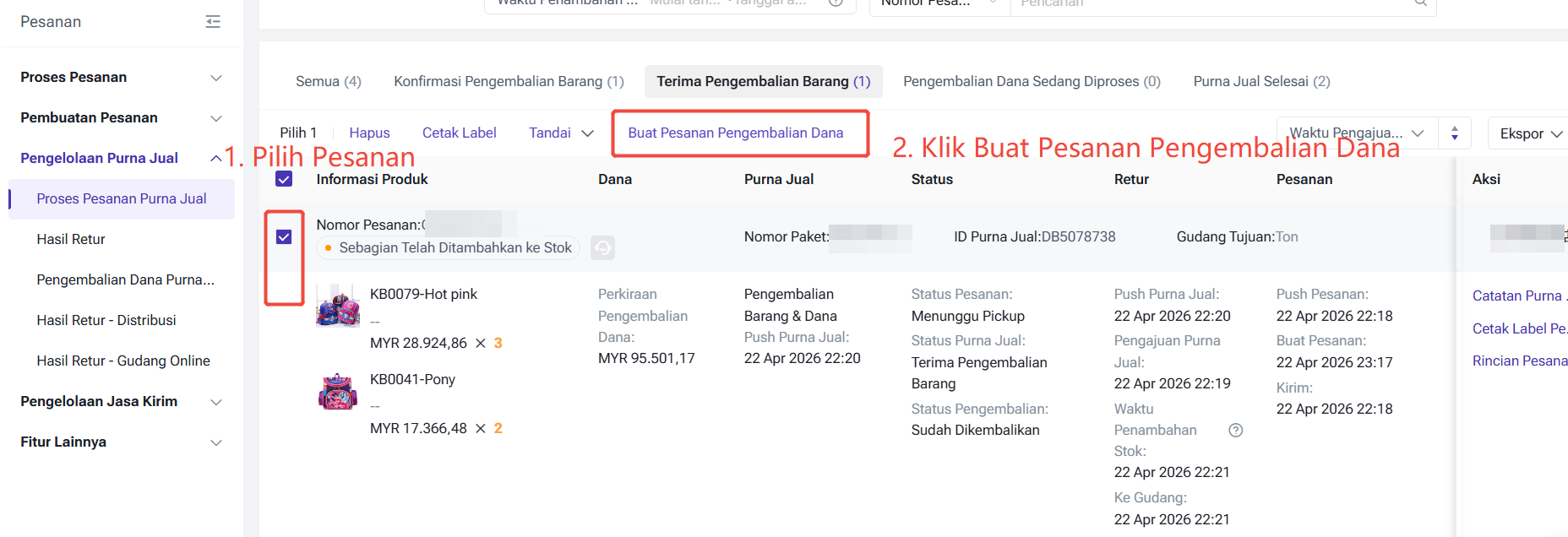 Konfirmasi Pengembalian Dana: Setelah konfirmasi pengembalian dana, pesanan nya akan dimasukkan kek status Purna Jual Selesai.