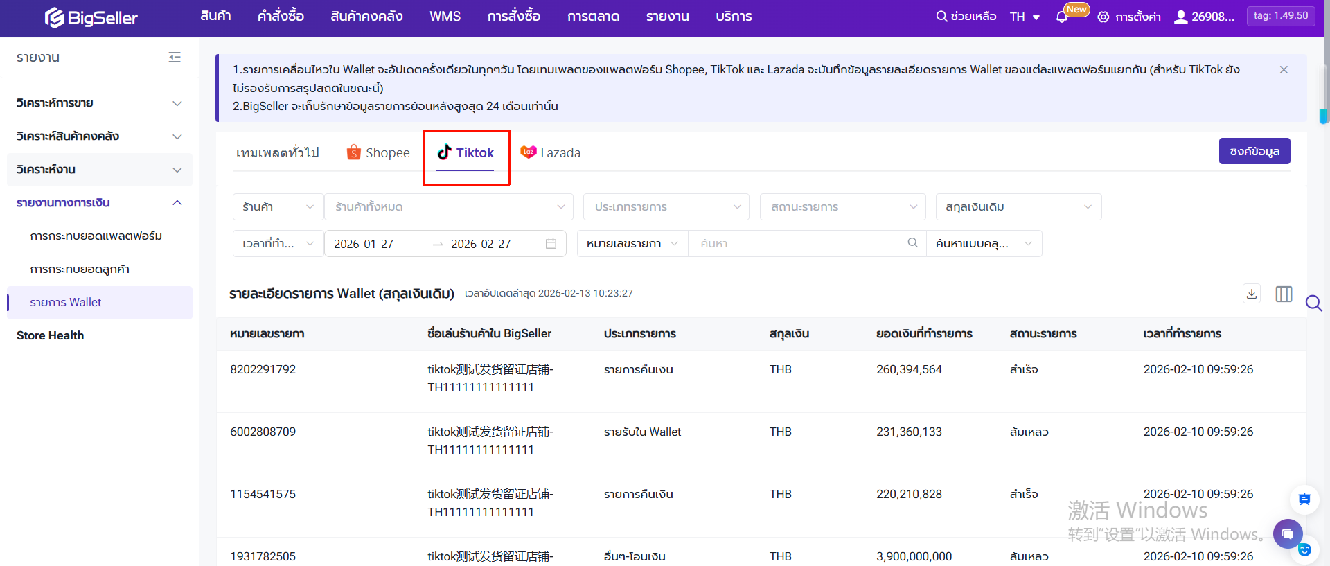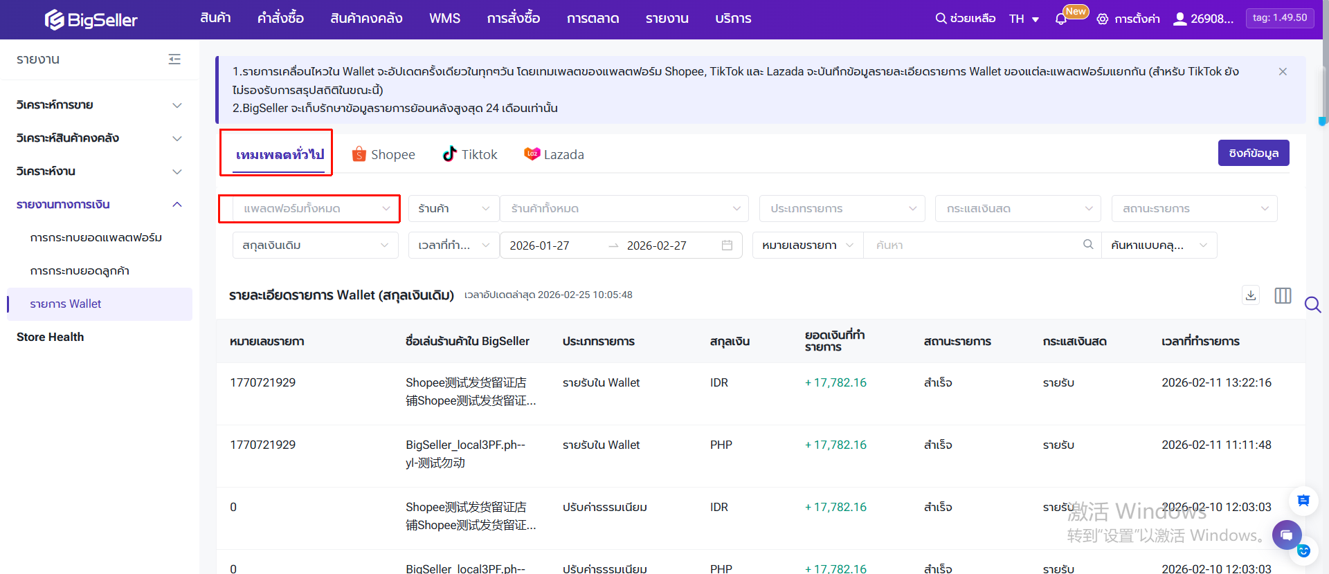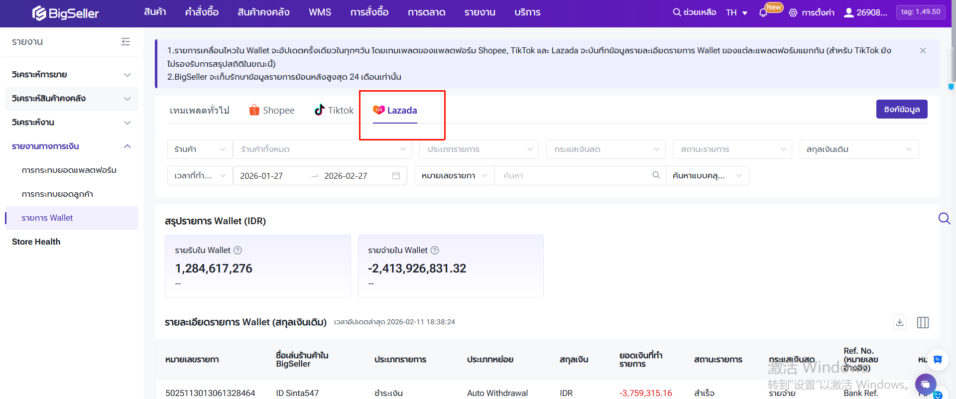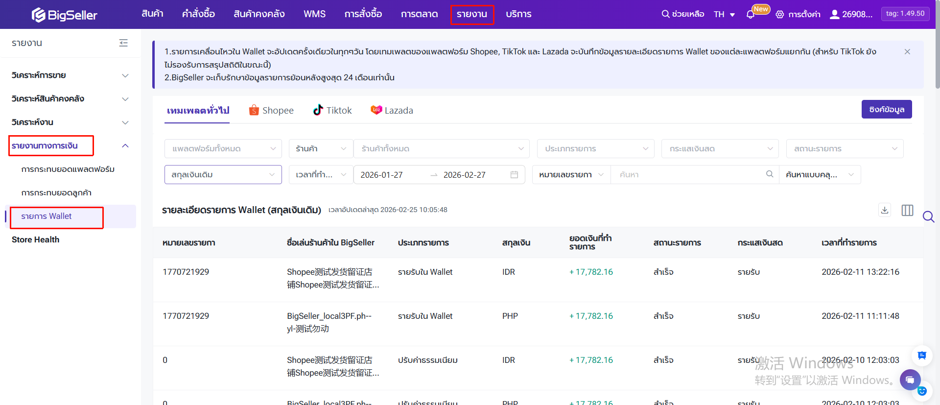 ไปยังเมนู รายงาน > รายงานทางการเงิน > รายงาน Wallet
