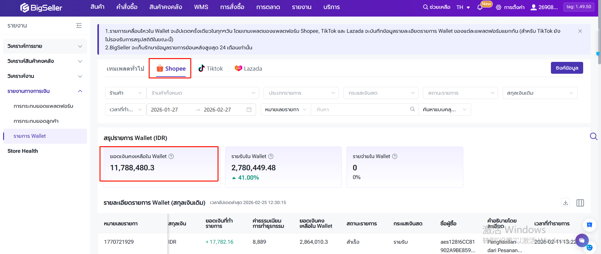 ผู้ใช้งานสามารถตรวจสอบรายละเอียดของรายรับหรือรายจ่ายของ Wallet จากแพลตฟอร์ม Shopee, TikTok และ Lazada เพื่อตรวจสอบว่าได้รับเงินจำนวนเท่าไร และเกิดขึ้นจากรายการอะไร