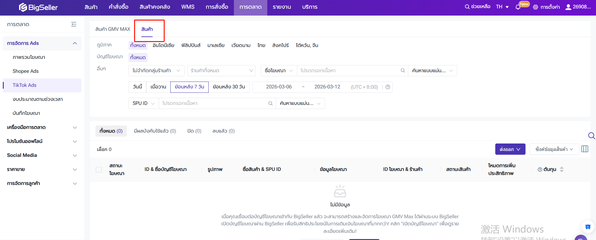 · หน้าเมนู "การตลาด" > "TikTok Ads"