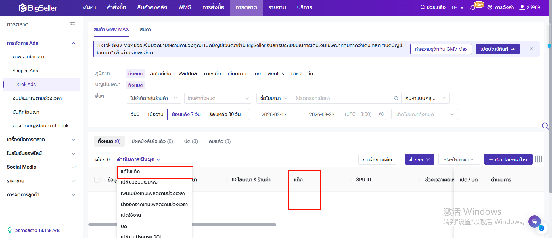 - หน้าเมนู "การตลาด" > "TikTok Ads"