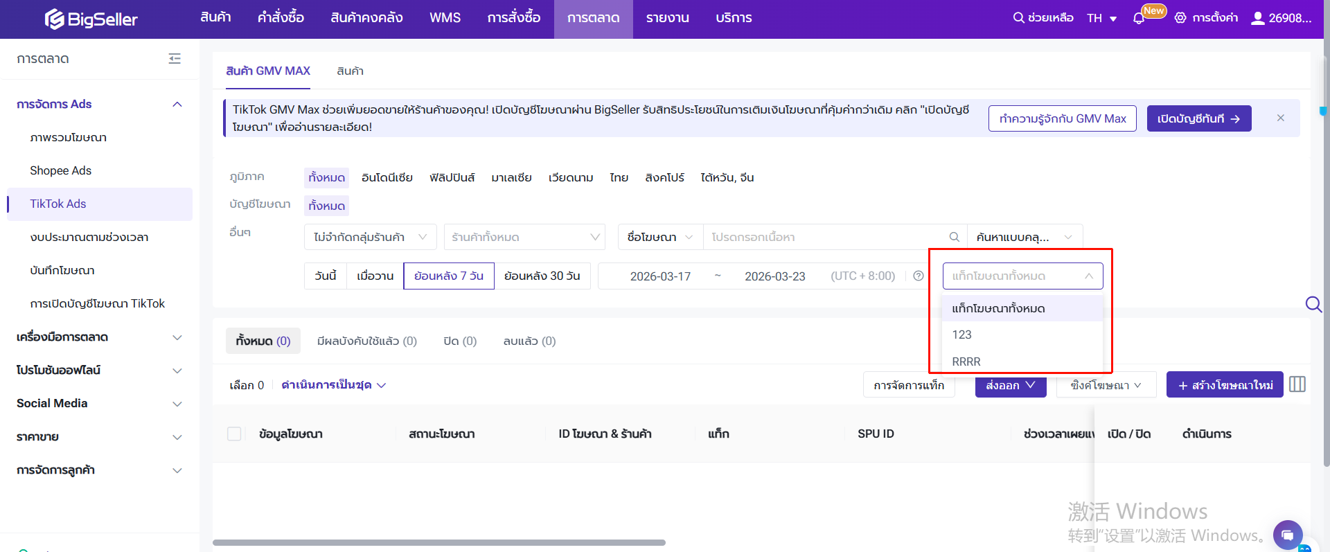ผู้ใช้งานยังสามารถเพิ่มแท็กให้กับโฆษณา เพื่อจัดการโฆษณาอย่างมีประสิทธิภาพยิ่งขึ้นในเมนู "สินค้า GMV Max" ผู้ใช้งานสามารถกด "การจัดการแท็ก" เพื่อสร้างแท็กโฆษณา