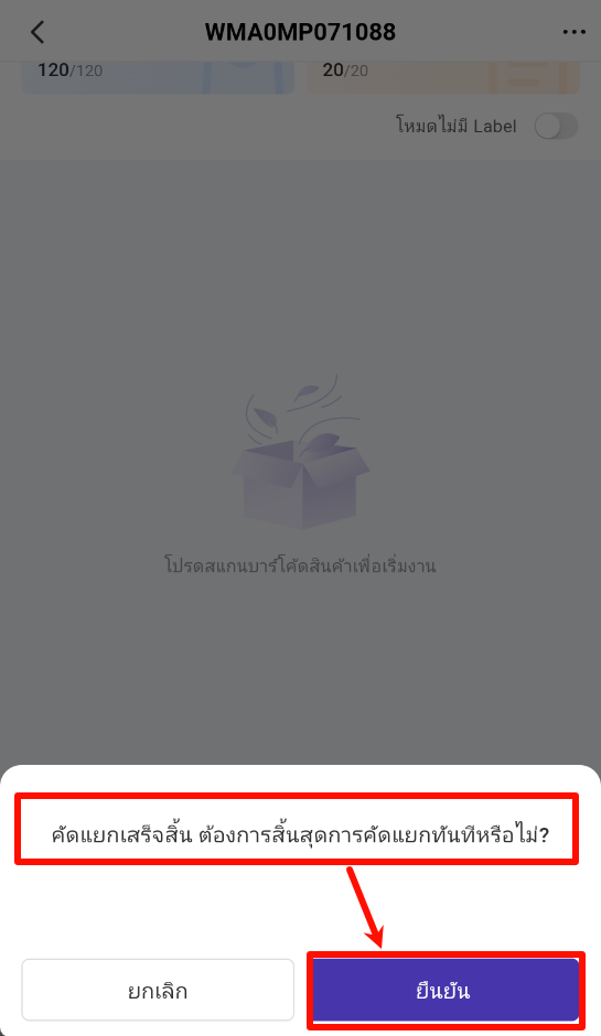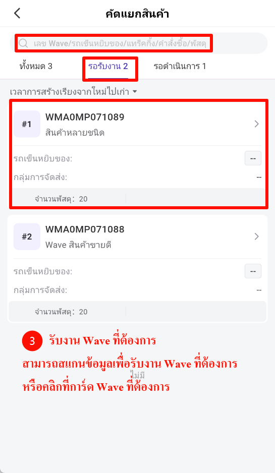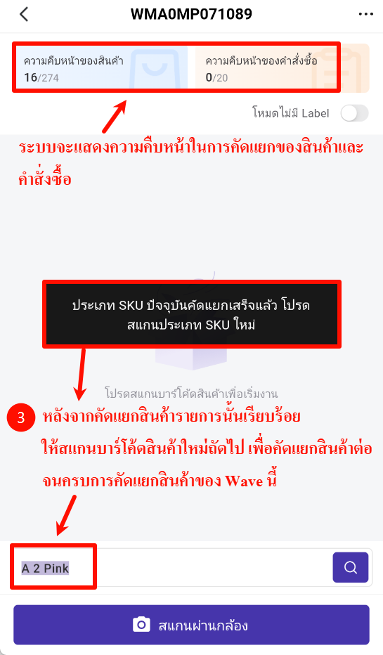 ขั้นตอนที่ 3 หลังจากคัดแยกสินค้ารายการนั้นเรียบร้อย ให้สแกนบาร์โค้ดสินค้าใหม่ถัดไป เพื่อคัดแยกสินค้าต่อ จนครบการคัดแยกสินค้าของ Wave นี้