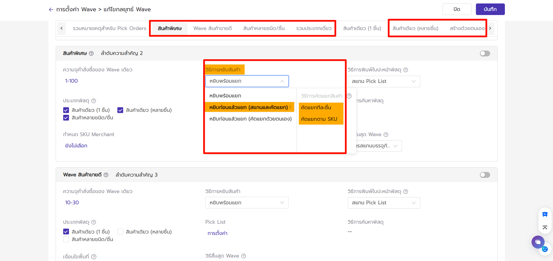 1. ก่อนสร้าง Wave ให้ตรวจสอบว่าประเภท Wave ของคลังสินค้าได้ตั้งค่าวิธีการหยิบสินค้าเป็น “หยิบก่อนแล้วคัดแยก (สแกนและคัดแยก)” บนเว็บไซต์เรียบร้อยแล้ว เนื่องจากต้องตั้งค่าวิธีการหยิบสินค้าเป็นแบบนี้ก่อน Wave จึงจะเข้าสู่ขั้นตอนการคัดแยกสินค้าหลังจากพิมพ์ Pick List ได้