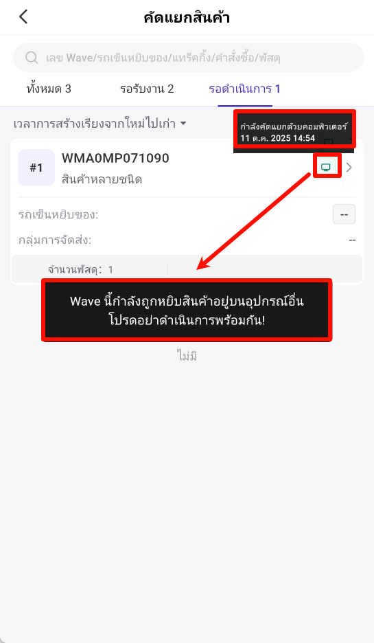 3. Wave ที่ดำเนินการคัดแยกสินค้าผ่านคอมพิวเตอร์แล้ว จะมีสัญลักษณ์รูปคอมพิวเตอร์ปรากฏ และจะไม่สามารถรับงานหรือดำเนินการผ่านแอปได้
