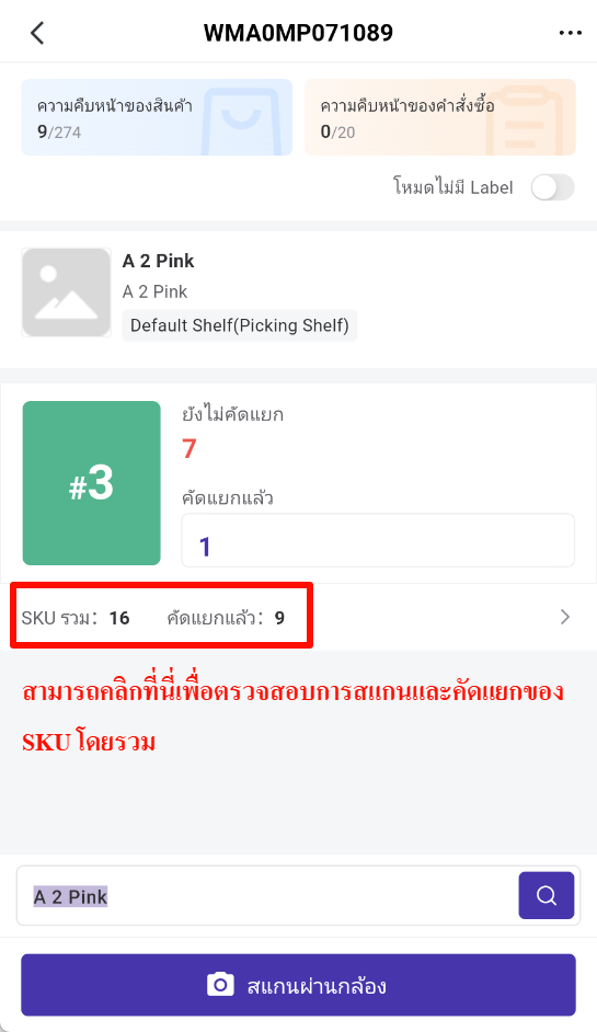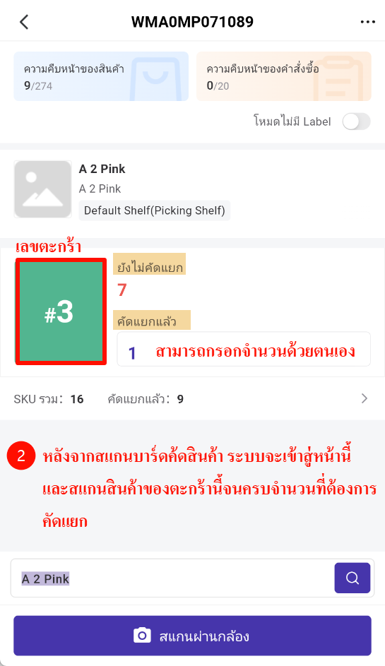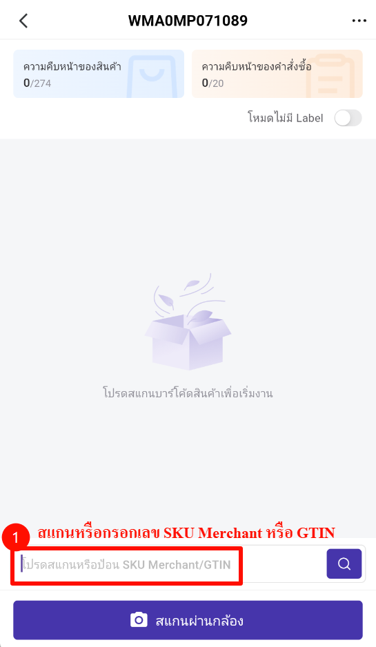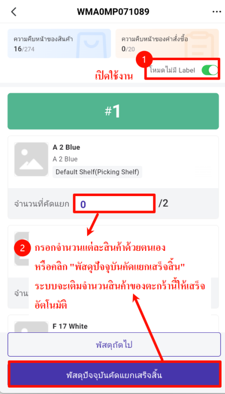 - หาก SKU ไม่มีป้ายสินค้า สามารถเปิดใช้งาน "โหมดไม่มี Label" เพื่อคัดแยกสินค้าได้