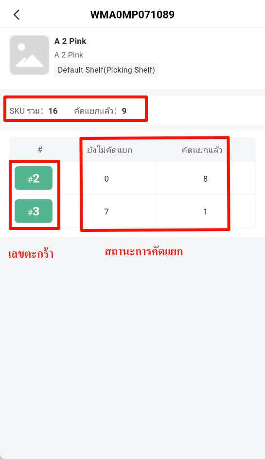 เมื่อเปิดใช้งานสองฟังก์ชันี้แล้ว ระบบจะแสดงจำนวนสินค้าและจำนวนประเภท SKU ของ Wave ในหน้าการคัดแยกสินค้าบนแอป
