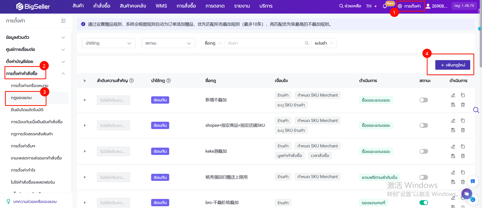 ไปยังหน้า "การตั้งค่า" > "การตั้งค่าคำสั่งซื้อ"> "กฎของแถม" > "เพิ่มกฎใหม่"